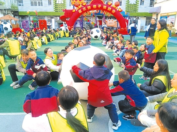 近日,曹洞区大三小学举办了一场亲子运动会。老师、孩子、家长共同参与,在有趣的互动中感受爱国情怀,共同培育良好品格。 (随州日报记者 杨凌 供图)